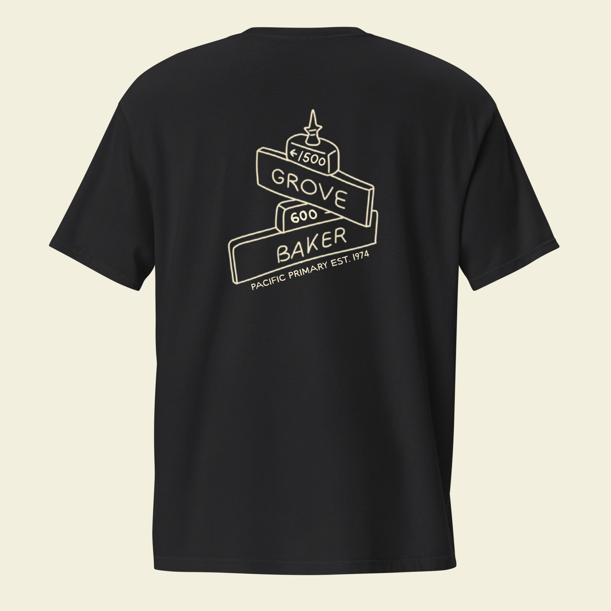 Grove & Baker printed on front pocket with back design. Printed on Comfort Colors, 100% cotton tees.